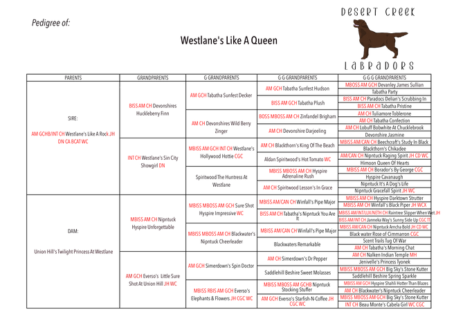 Reign is our all around perfect Labrador. She has such a well balanced temperament. She loves to retrieve, snuggle up on the couch, and go on all our adventures with us. Whether you need her to stay calm at your feet, or hit the fields to hunt, she adjusts to her environment and doesn't skip a beat! Reign is also a Service Dog for our daughter. Her trainability is unmatched, and it is so fun to continue training new tasks as a working dog. She is producing phenomenal puppies, many of which are Service Dogs, or are in training!